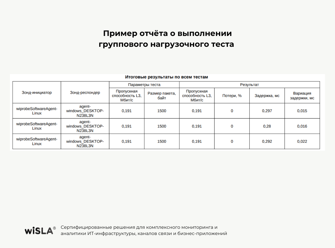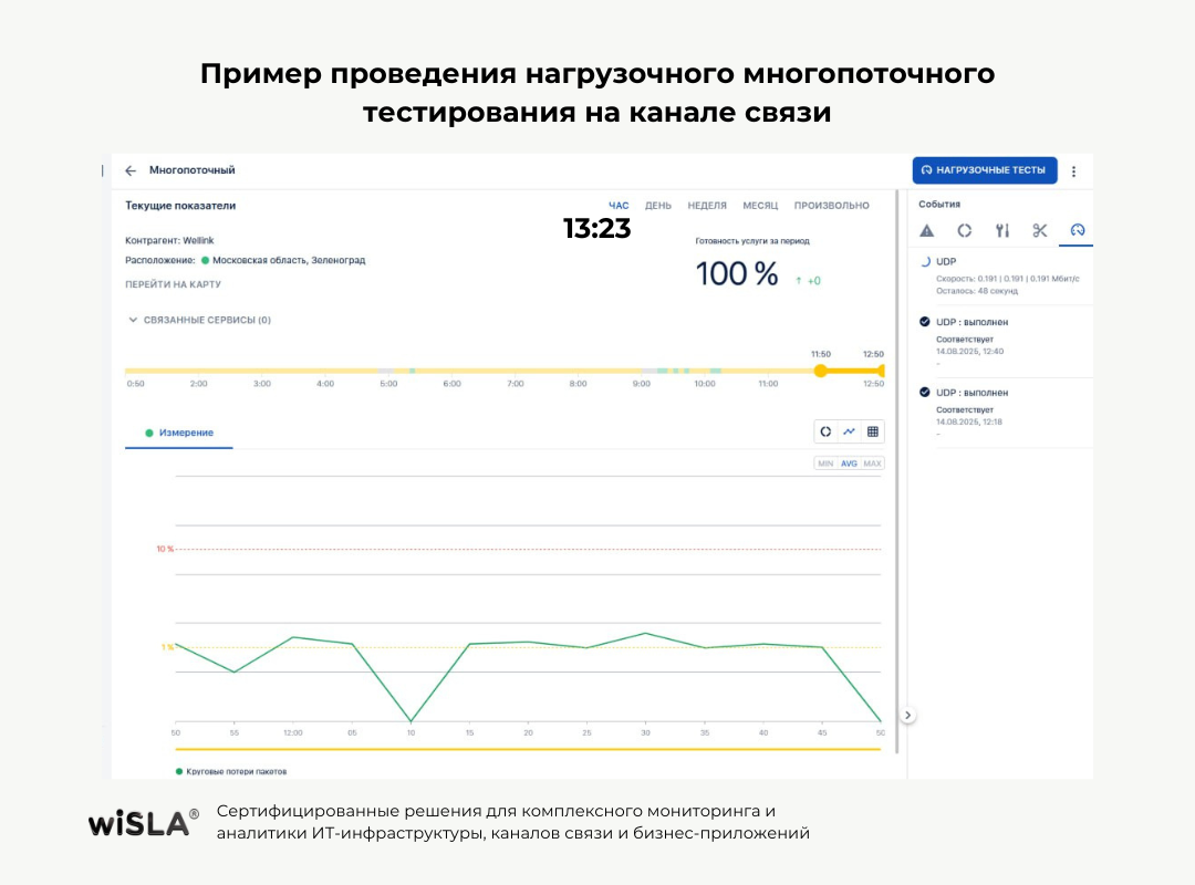 28.08.2025Интервальный нагрузочный тест — это запатентованная технология платформы wiSLA, предназначенная для проверки соответствия реальных характеристик канала связи к заявленным. Этот инструмент создает длительную нагрузку на канал и в течение всей сессии каждые 10 секунд фиксирует критически важные параметры: кратковременные снижения пропускной способности, стабильность соединения, отслеживание резких скачков нагрузки на сеть, потери пакетов.