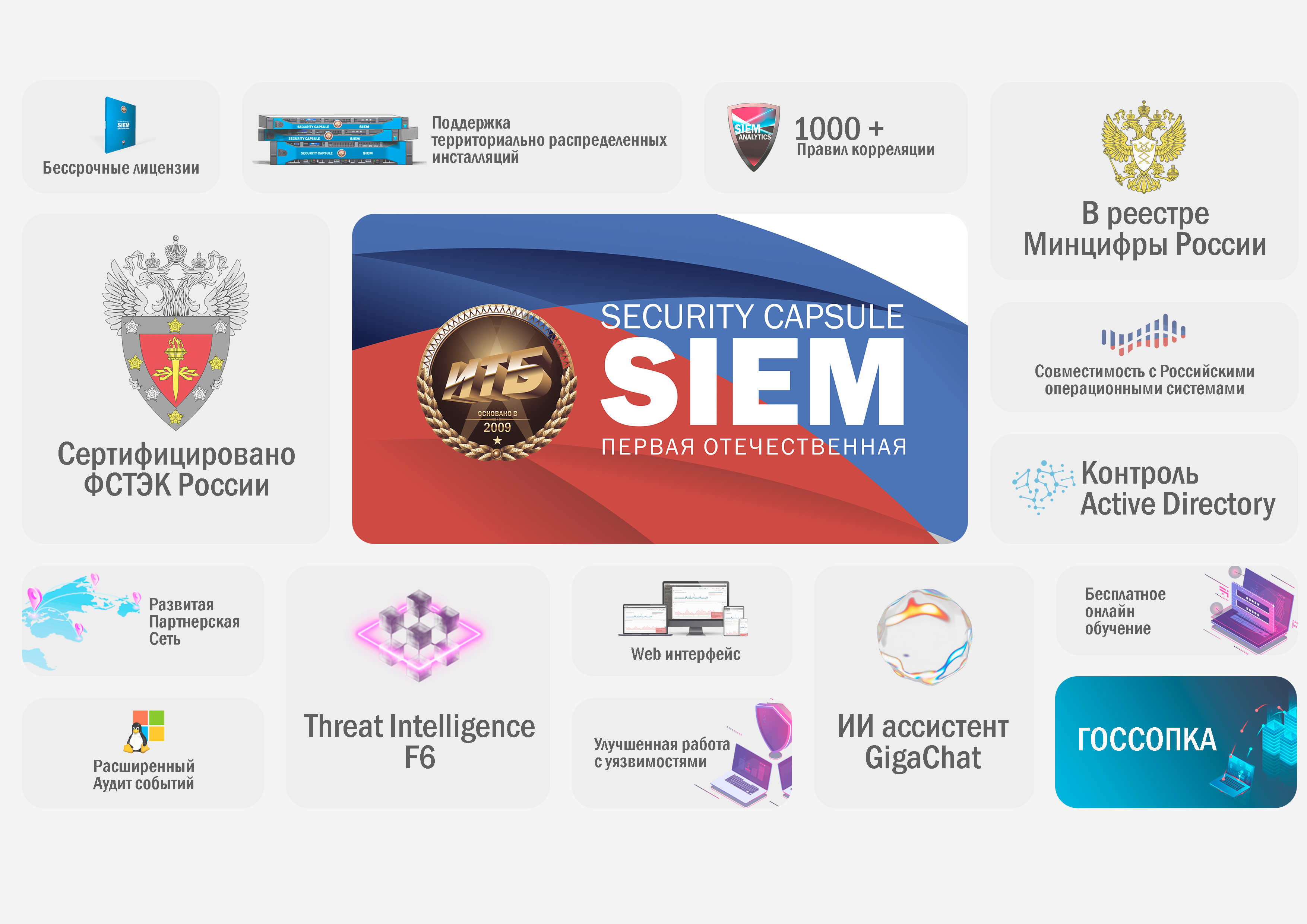 Система мониторинга и корреляции событий информационной безопасности Security Capsule SIEM (Security information and event management) разрабатывается с 2009 года является отечественным программным обеспечением и по праву может считаться Первой Российской SIEM-системой.Security Capsule SIEM сертифицирована ФСТЭК России, а также зарегистрирована в едином реестре Минкомсвязи России российских программ.Security Capsule SIEM может применяться при создании систем защиты: На объектах критической информационной инфраструктуры (КИИ) В составе государственной системы обнаружения, предупреждения и ликвидации последствий компьютерных атак (ГосСОПКА) В автоматизированных системах управления технологическими процессами (АСУ ТП) В государственных информационных системах (ГИС) В информационных системах персональных данных (ИСПДн)