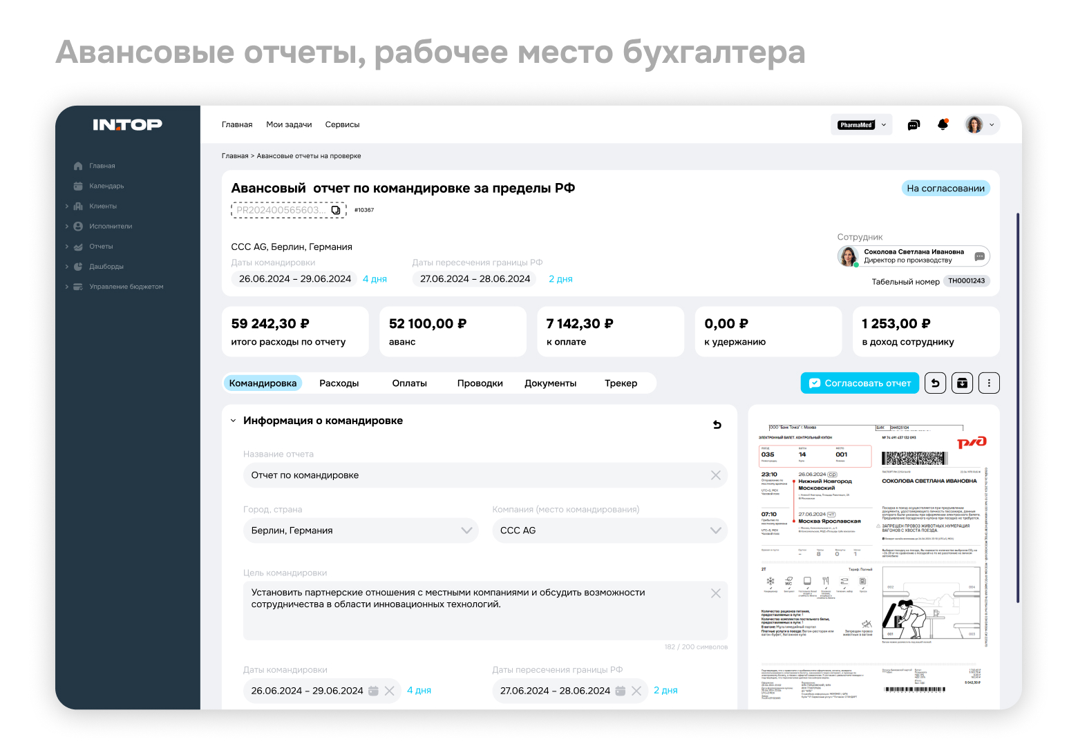 IN.TOP Tera объединяет в одной системе сотрудников, руководителей и бухгалтерию. Решение автоматизирует значительную часть рутинных операций: проверку расходов, формирование документов, расчет суточных и курсовых разниц. Это снижает нагрузку на сотрудников и бухгалтерию и помогает поддерживать контроль расходов на всех этапах процесса.