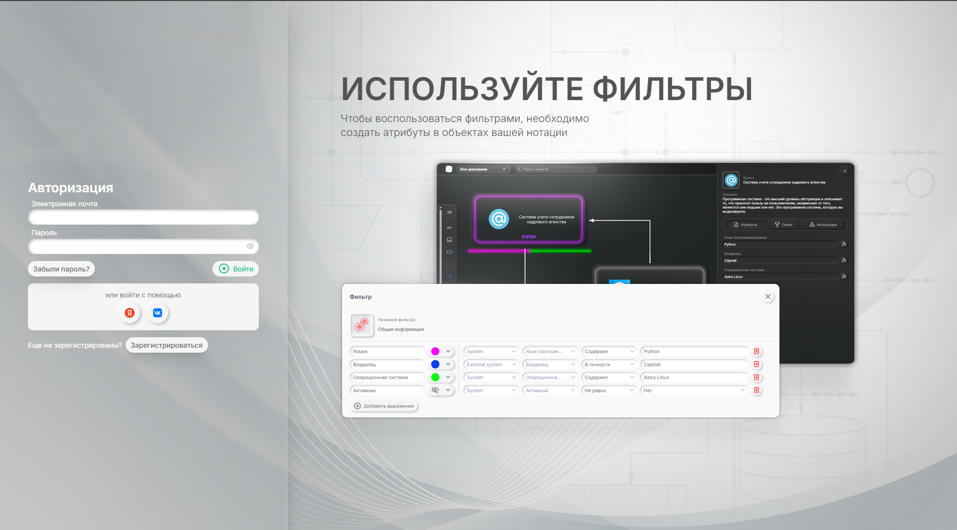 - фильтрация по значению атрибутов (скрытие и подсвечивание);